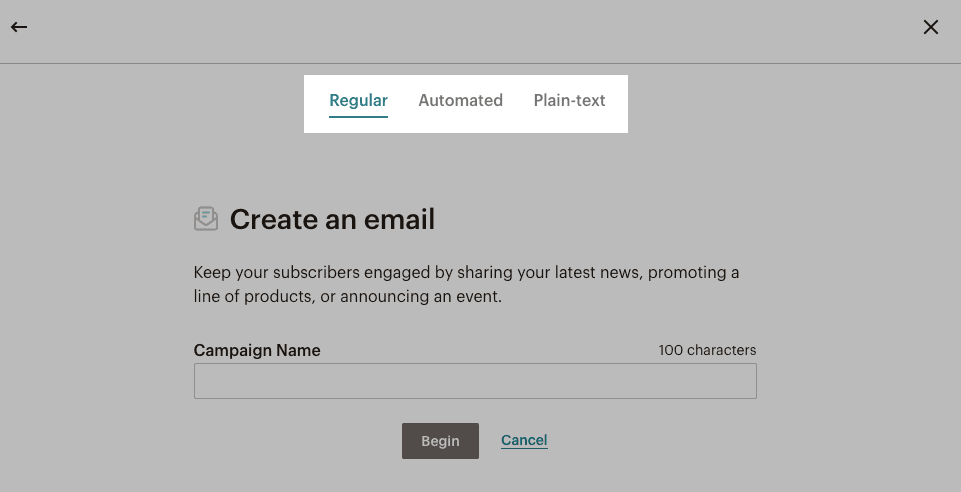 - Choose the type of email campaign you want to create: regular, automated, or plain-text. Learn the difference between these types of campaigns in Mailchimp’s guide: Getting Started with Campaigns (opens in a new tab).