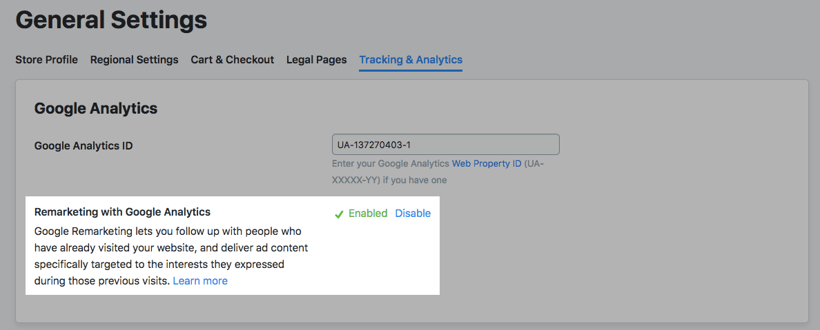 From your store's admin, go to Settings → General → Tracking & Analytics. In the Google Analytics block, enable the Remarketing with Google Analytics setting.