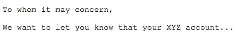 - It begins with a vague greeting like "Dear account holder." Reputable companies will have your name in the salutation, as opposed to "valued customer" or "to whom it may concern."