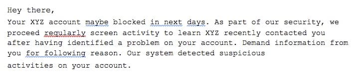 - It is poorly written and contains typos, misspellings, unnecessary capitalizations, etc. Legitimate messages usually do not have major spelling mistakes or poor grammar.