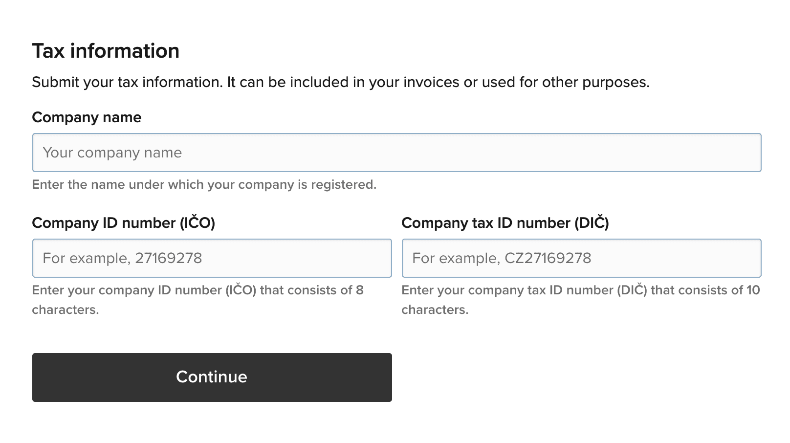 If your store is based in the Czech Republic or Slovakia, you’re required by law to collect IČO numbers from your local business customers, and you may also collect their DIČ numbers. You can enable a special block at checkout to allow B2B customers to provide their tax information when placing orders.