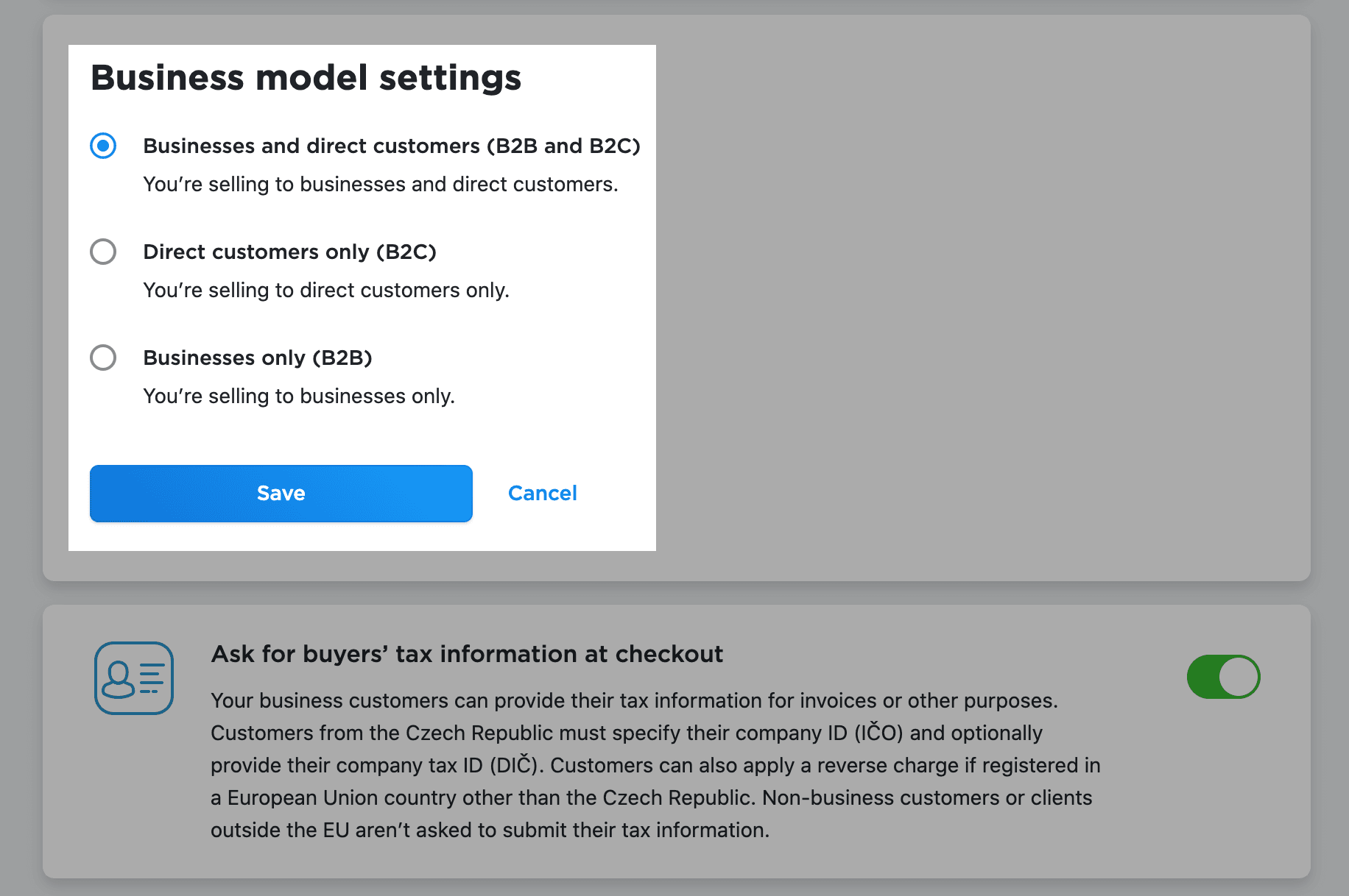 In the business model settings block, specify who your customers are: Businesses and direct customers (B2B and B2C) or Businesses only (B2B):