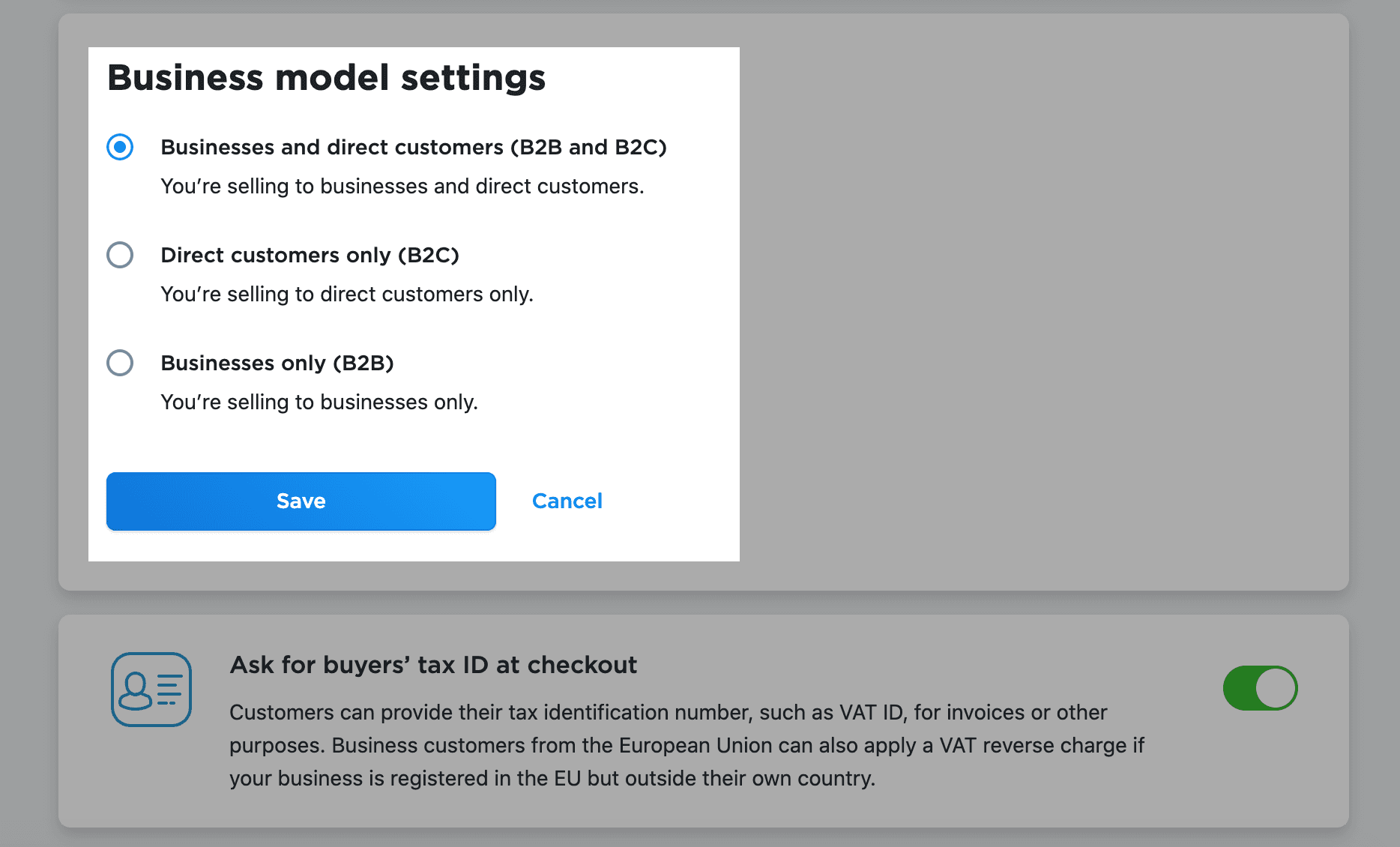 You can allow customers to provide their tax IDs at checkout. For example, if you’re required to collect specific tax information in your country by law, or if you want to use tax IDs provided by customers to issue invoices — in your online store or in the outside invoicing software of your choice.