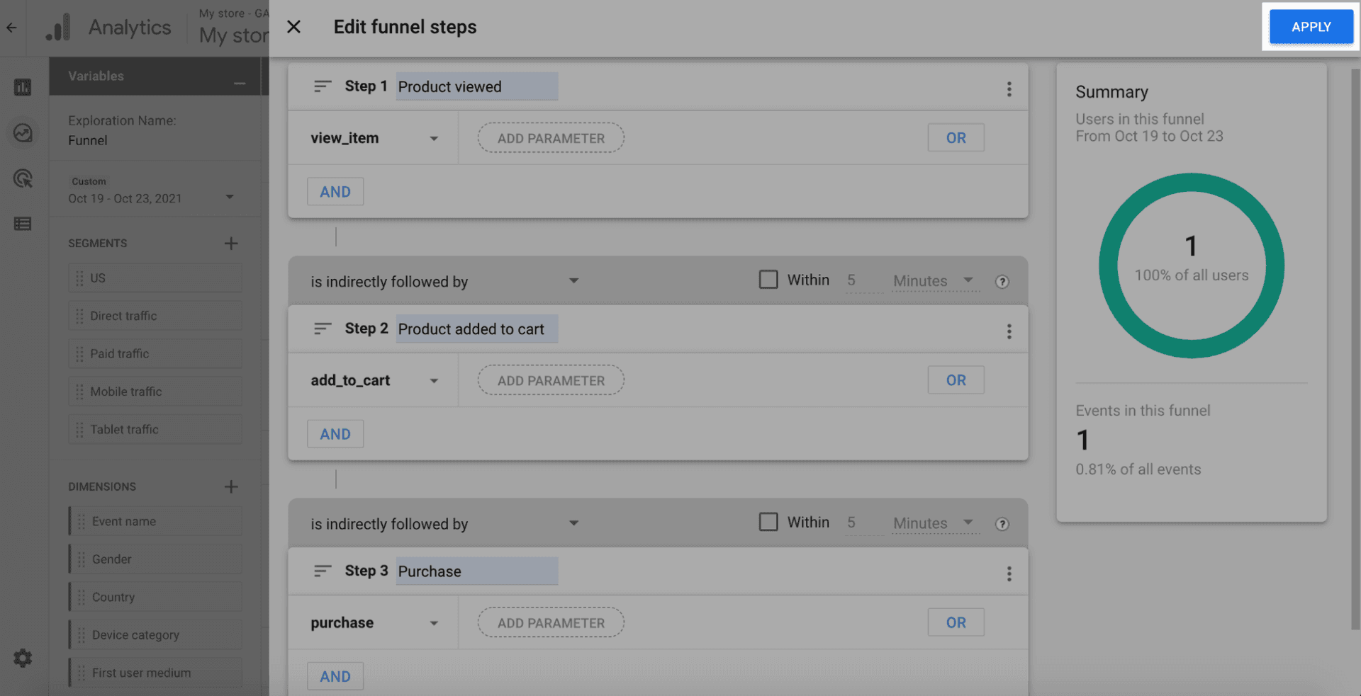 One of the most important explorations for an ecommerce store owner is the Funnel exploration. It can help you analyze how your customers move through different steps of the store visit, starting from the moment they enter your store until the moment they actually make the purchase (if they do). To build the steps of the funnel, you can use various conditions, including the events that you’re already tracking.