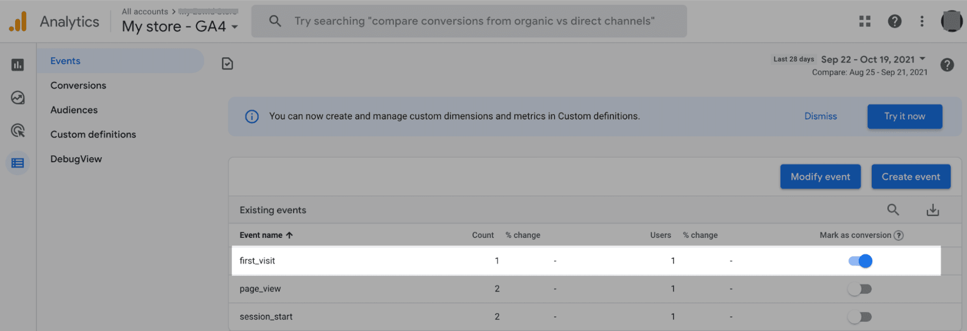 In Google Analytics 4, you can use conversion events (opens in a new tab) to measure store visitor activities that interest you most. These can be such important events as buying a product or visiting your store for the first time. Once you mark your special events as conversions, you can get reports on them (e.g., the number of conversions over time).