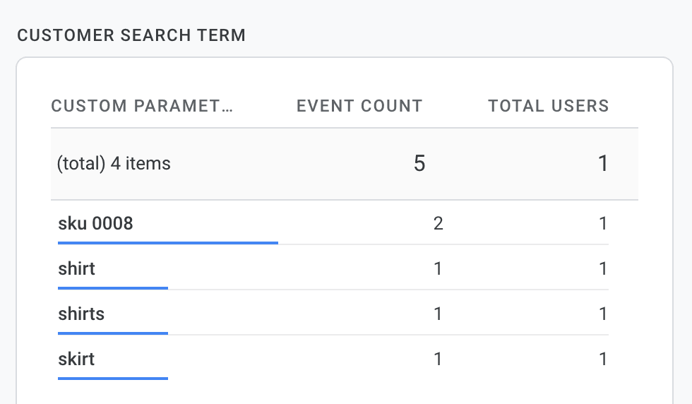 You can automatically collect the terms that your customers typed into the search field in your store. To be able to store historical data on the search terms, you will need to add a custom dimension (opens in a new tab) to the search_term parameter of the view_search_results event.