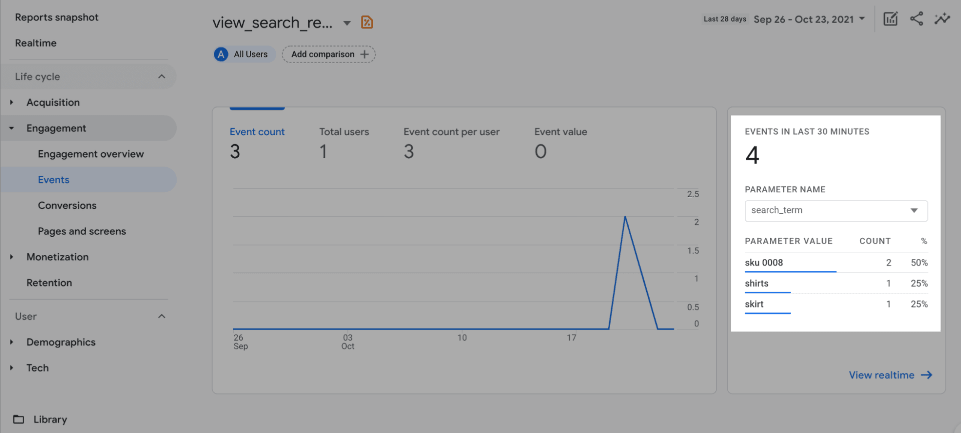 You can also view the most recent search terms on top of the page, in the Events in last 30 minutes section. For that, select search_term from the Parameter name dropdown: